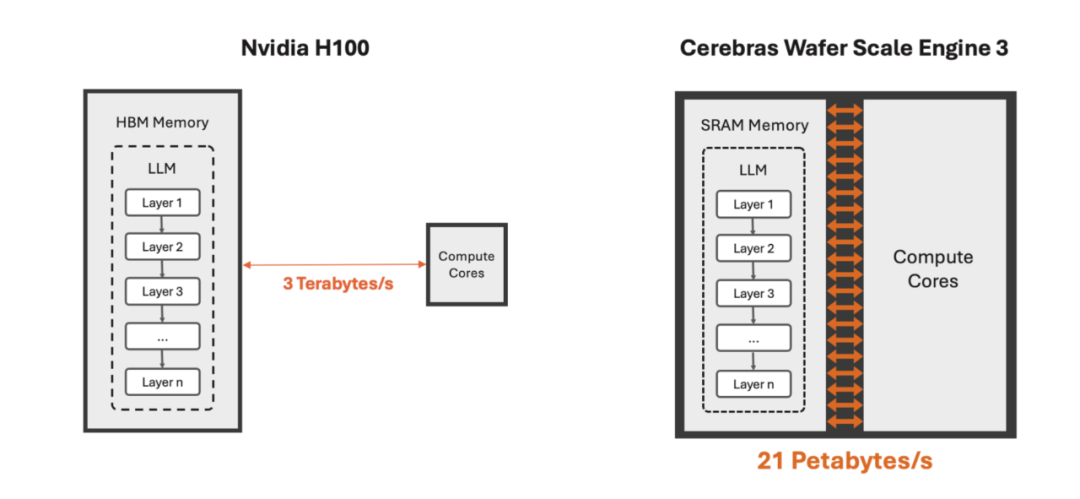 Cerebras WSE 与 英伟达 H100 存算带宽对比,引自 Cerebras 博客
