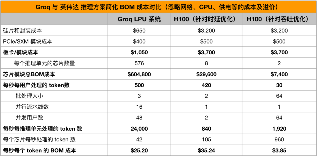 Groq 与 英伟达 H100 推理方案简化 BOM 成本对比,译自 SemiAnalysis 测算